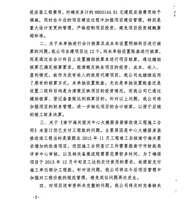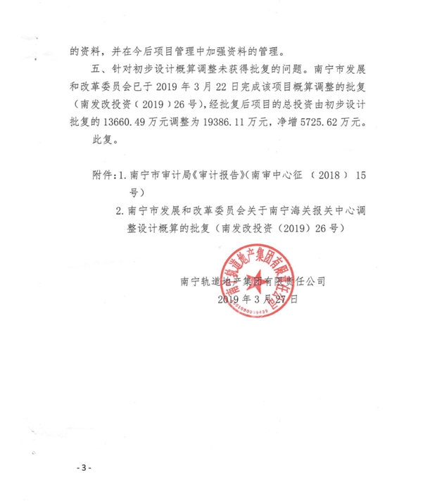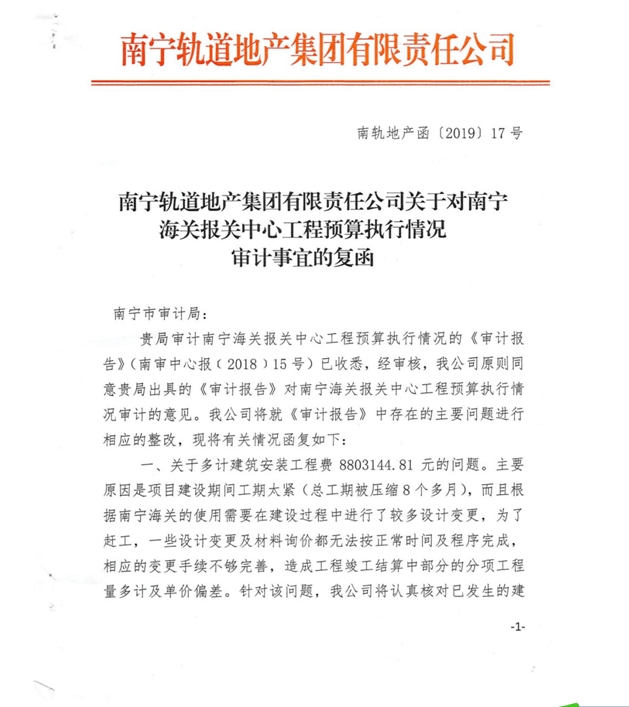 南寧軌道地產(chǎn)集團有限責任公司關(guān)于對南寧海關(guān)報關(guān)中心工程預(yù)算執(zhí)行情況審計事宜的復(fù)函